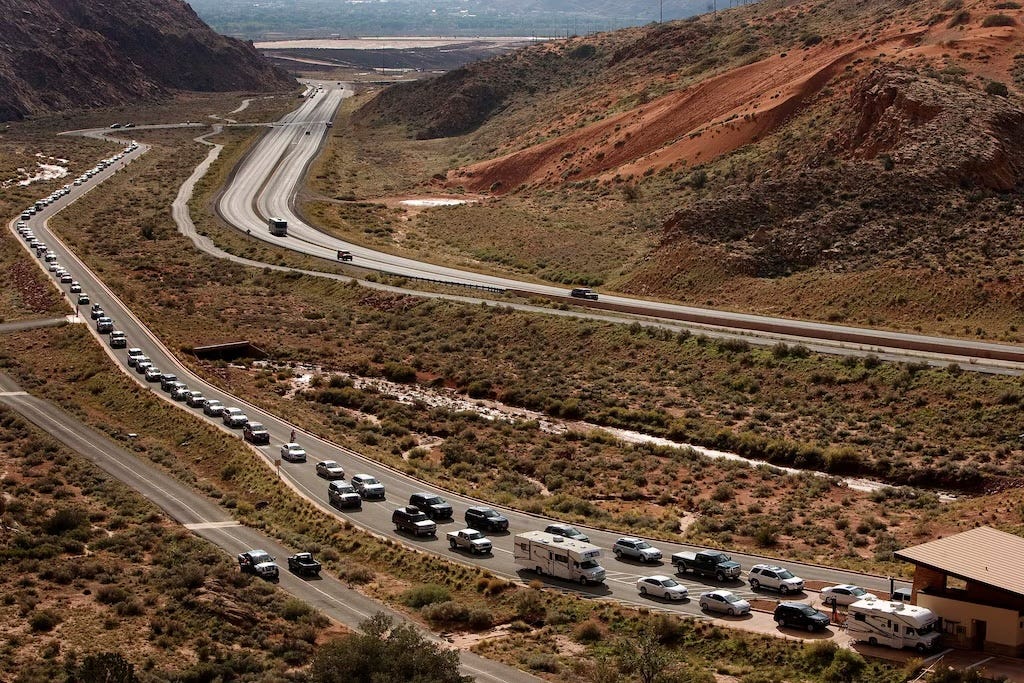 A long line of vehicles queue up to enter Arches National Park in 2013. Photo by Leah Hogsten/ The Salt Lake Tribune